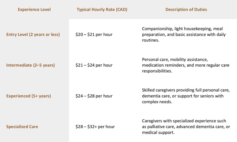 Hourly salary is determined based on the employee’s level of experience and the specific duties required for the position. Because every family and role can be different, rates may vary depending on the responsibilities involved. If you require a different type of salary calculation or would like assistance determining an appropriate rate, please feel free to contact us at 905-226-6278, and our team will be happy to help.